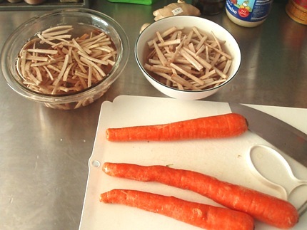 一、處理牛蒡。牛蒡削皮,切成條狀。削絲也可,但會比較不脆。注意的是,牛蒡口感較澀,切開後切口會馬上變色,所以必須馬上泡水,柔緩口感。