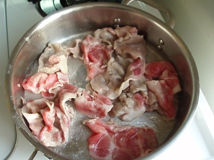三、將豬肉炒到變色。要吃飯的朋友,這時白飯就要放進電鍋煮了。