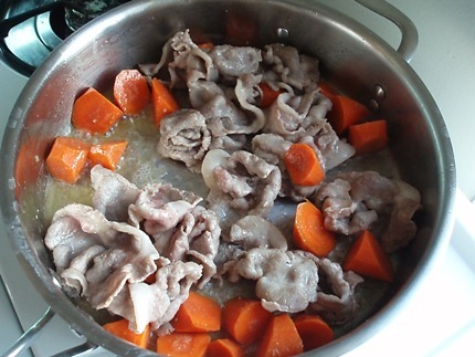 四、加入紅蘿蔔快炒。在這個步驟,原本應該加入切成塊的蒟蒻一起炒,但因為臨時買不到蒟蒻塊,結果買了蒟蒻麵,怕炒爛,所以就沒放下去炒。
