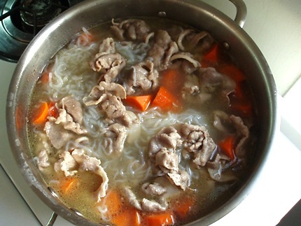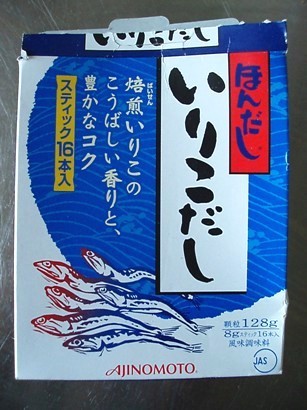 五、冒出香氣後,倒入高湯。原本要用真正的柴魚昆布高湯,但懶得去日本超市,就用這調味料和水成高湯;這是日本朋友送我的,是不是就是台灣的烹大師?