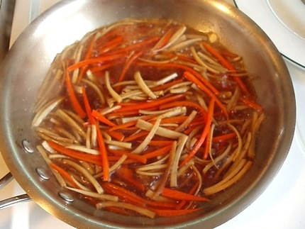 七、然後開始炒牛蒡與蘿蔔。先在鍋中倒滿麻油,將牛蒡與蘿蔔丟進去,快炒。食材全部沾上麻油之後,倒入1/2杯的高湯、一大匙醬油,跟3/4匙的砂糖。持續拌炒,湯汁收乾之後,就可起鍋。