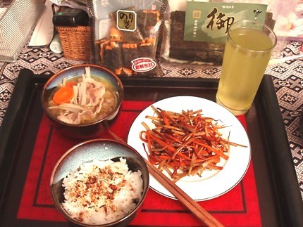 十、成了!家裡正好有日本碗,盛入「豚汁」,剛煮好的白飯灑上有白芝麻、柴魚、海苔、鹽、糖的「ふりかけ」(中文不知道叫什麼),炒牛蒡蘿蔔,配上冰綠茶,就是營養豐盛的和風晚餐。沒有日式的飯後甜點(好想吃白玉宇治金時),不過家裡有海苔米果;當天也買了提拉米蘇。
