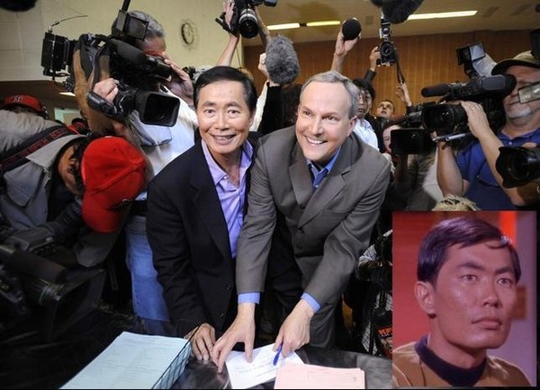 其中一對前往結婚的,是在電視劇「Star Trek / 星艦迷航記」當中飾演 Sulu 艦長(後來有拔升成艦長)的喬治武井(George Takei),跟他在一起長達21年的男友 Brad Altman 終於成婚。他結婚時套用劇中最理性的種族 Vulcan 著名的招呼語跟手勢,說:「Live “equally” long and prosper/平等長存繁榮」。
