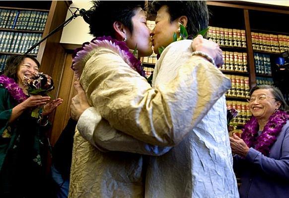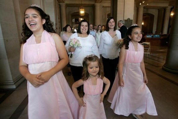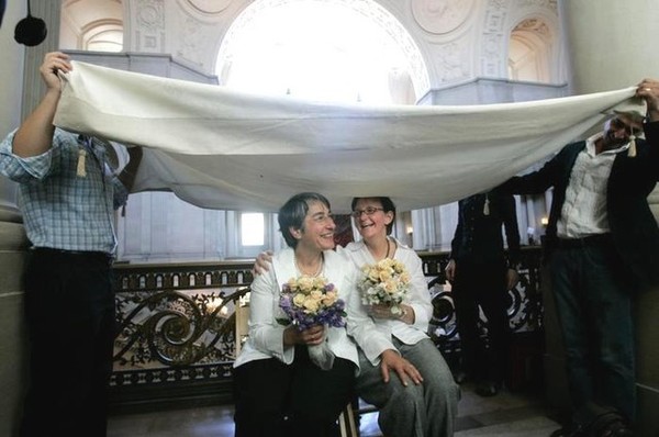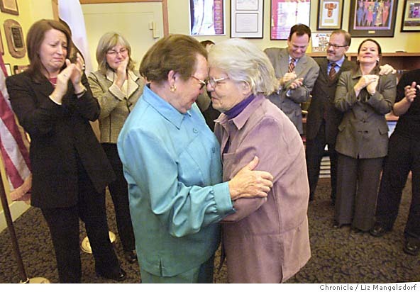 她們的朋友,全國女同志權益中心主任 Kate Kendell,以及舊金山商會副主席 Roberta Achtenberg,參加她們的婚禮,忍不住哭了。