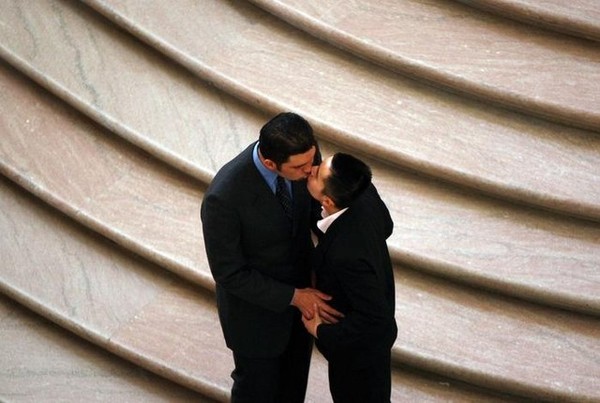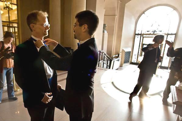 John Lewis 在舊金山市府為他馬上要成為丈夫的 Stuart Gaffney 打正領帶。他們兩位2004年結過婚,卻又被宣判婚姻無效,如今正義與真愛終於獲得伸張。