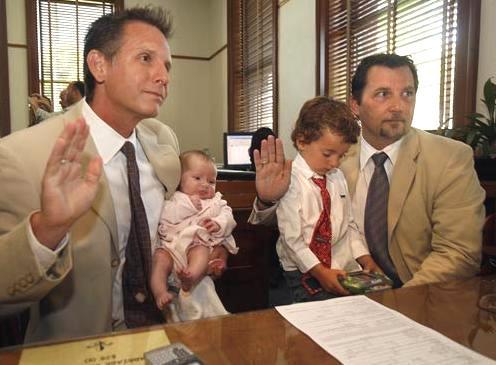 Jeff Van Hooser 跟 Greg McCollum 帶著女兒 Kate 與兒子 Lucas 在 Santa Ana 宣誓成婚。
