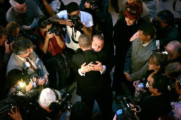 Joe Alfano(左)結完婚之後,在舊金山市政廳感動的緊抱老公 Frank Capley。