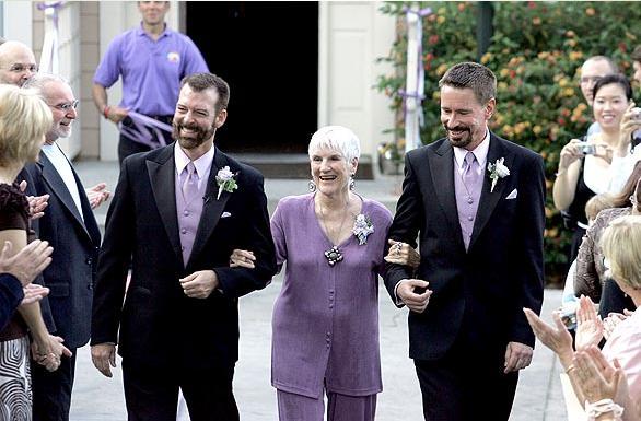 左起是 Paul Waters、Paul的媽媽 Peggy Waters,跟新的半子 Kevin Voecks。Paul 跟 Kevin 已經住在一起15年,連媽媽都已經承認了,卻直到今日才被承認婚姻關係。
