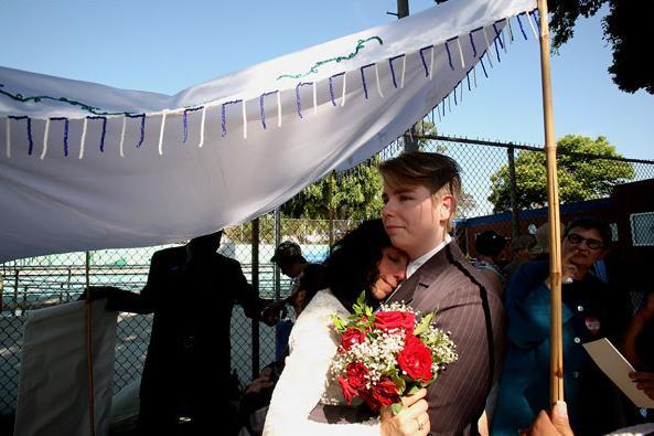 上面只有看到婚紗跟戒指的 Amber Weiss(右)跟老婆 Sharon Papo,剛結完婚,由 Amber Weiss 的媽媽 Patty Weiss 陪著離開市政府。