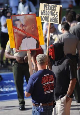 有一位現場示威者 Richard Mouw 說:「同性相親是逾越雷池。上帝創造我們不是叫我們搞同性戀的 / Homosexual intimacy is out of bounds. It's not what God created us for」。這位先生是基督教帕沙迪納福音派富爾神學院的院長。 (Evangelical Fuller Theological Seminary in Pasadena)