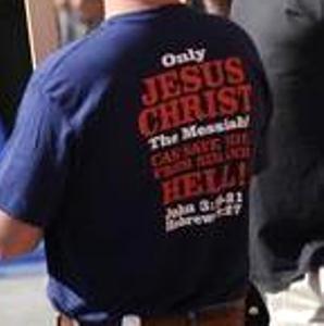原來寫著「耶穌是唯一救主」;還有什麼下地獄之類的,字太小看不清楚了。