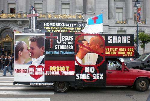 婚禮場外,高舉十字架、寫滿聖經文字與咒罵同性戀話語的卡車。